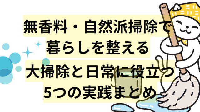 暮らし 無香料・自然派掃除で暮らしを整える|大掃除と日常に役立つ5つの実践まとめ 香りに疲れた方へ。無香料・自然派掃除を選ぶ理由と、猫と暮らす家庭でも取り入れやすい掃除アイテム・考え方を関連記事とあわせて紹介します。 2025.12.29 暮らし