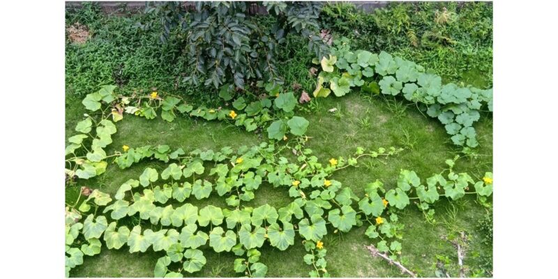 野菜くずに混ざっていた種から、かぼちゃが芽を出し、庭いっぱいに広がったのです。